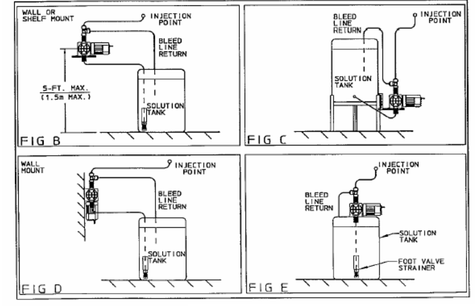 提示:连接点必须高于溶液槽的顶部,这样可阻止因重力进料。100 系列泵的最大扬程为 70M, 150 系列为 42 米。